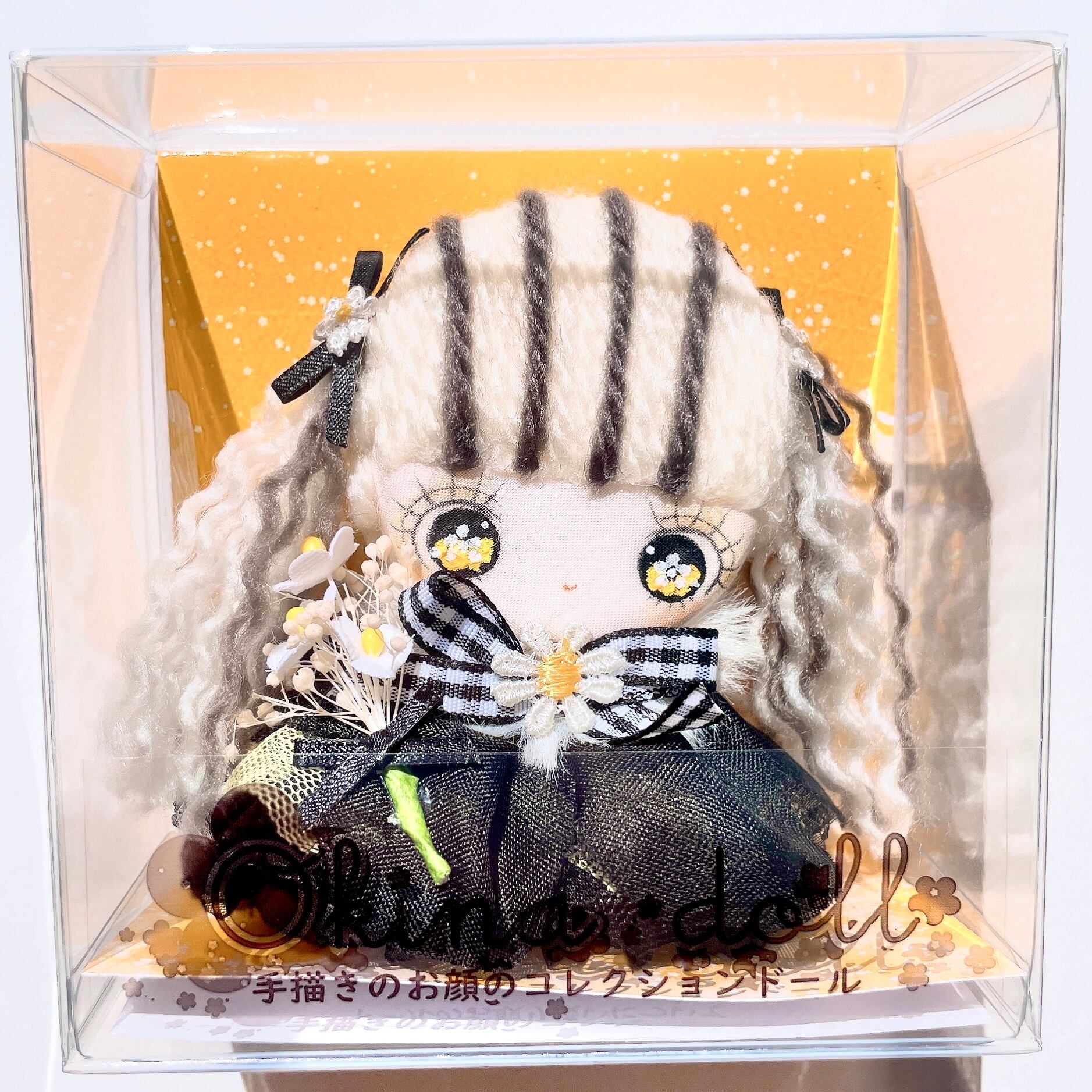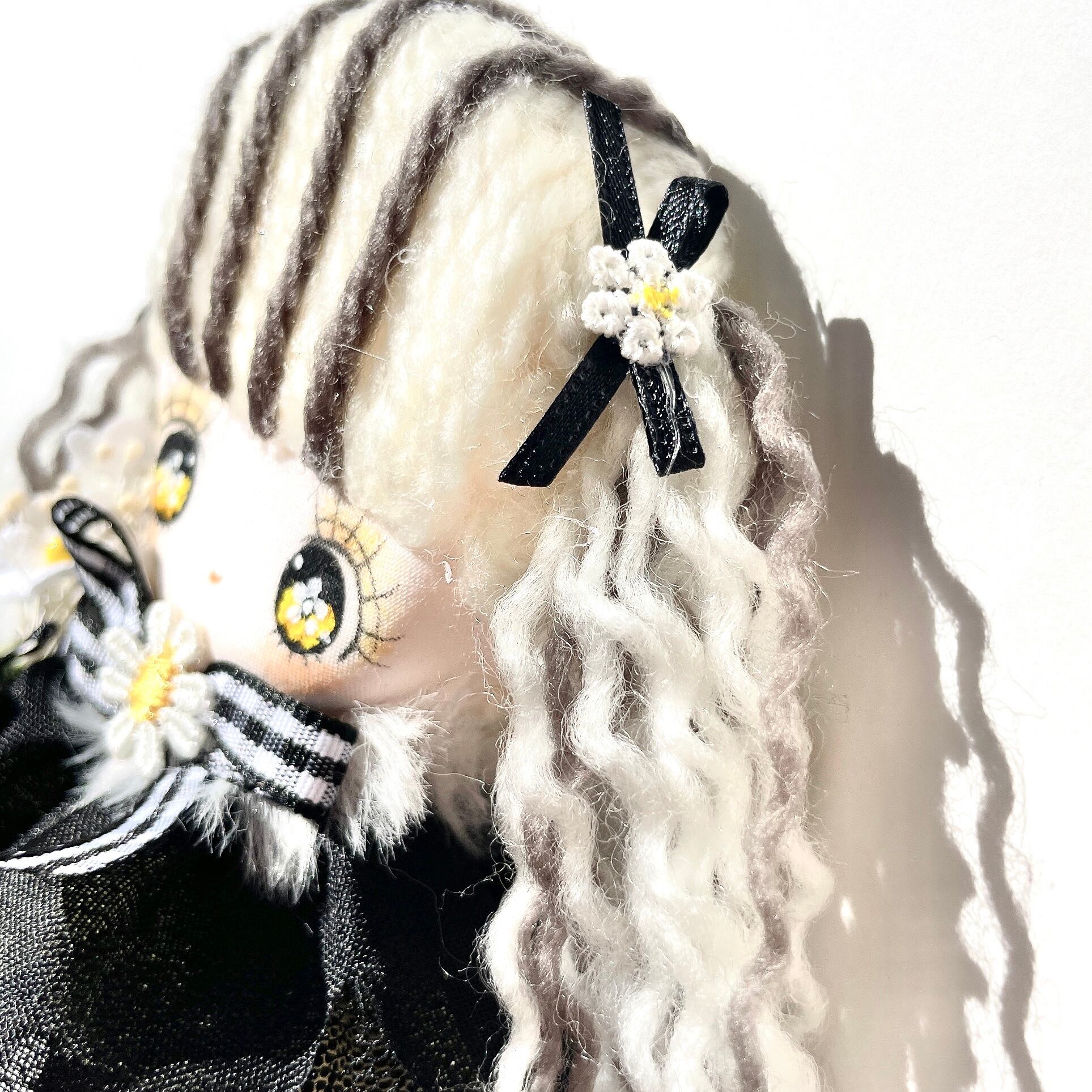 手描きのお顔は、全体的に‘’可愛いけど強さを感じるお顔”にしています。ちょっぴり強気な女の子って可愛いですよね。瞳は、ハチが集めた花粉をイメージしてブラックアイにイエローで表現しています。